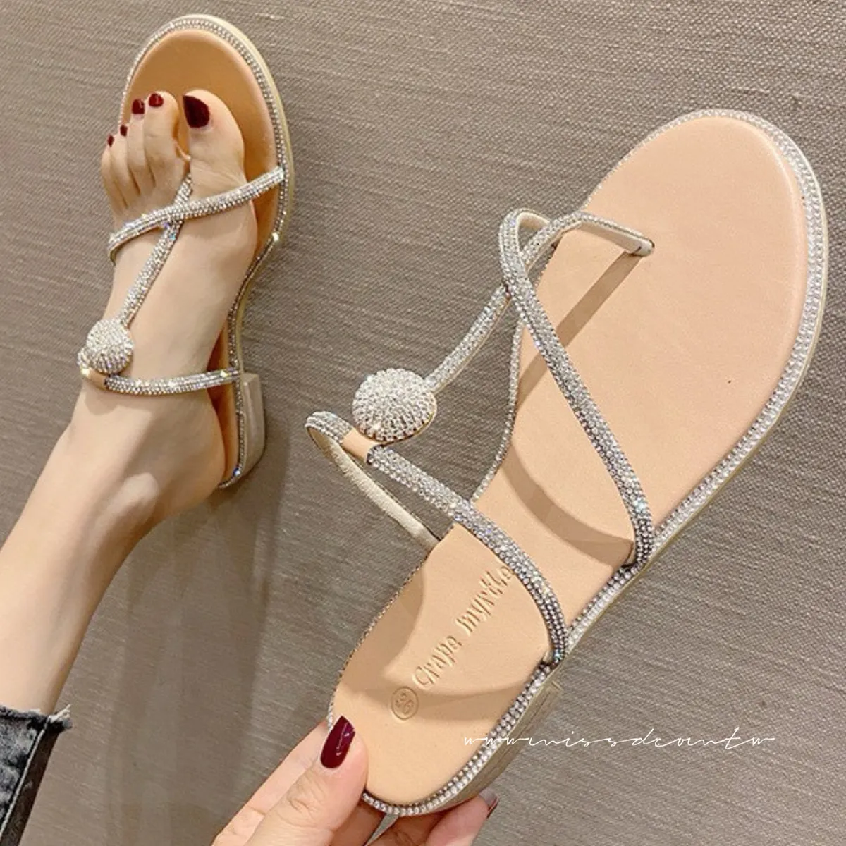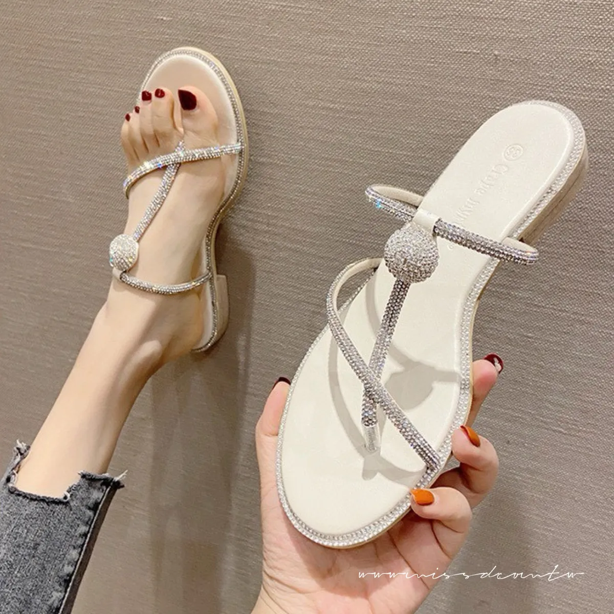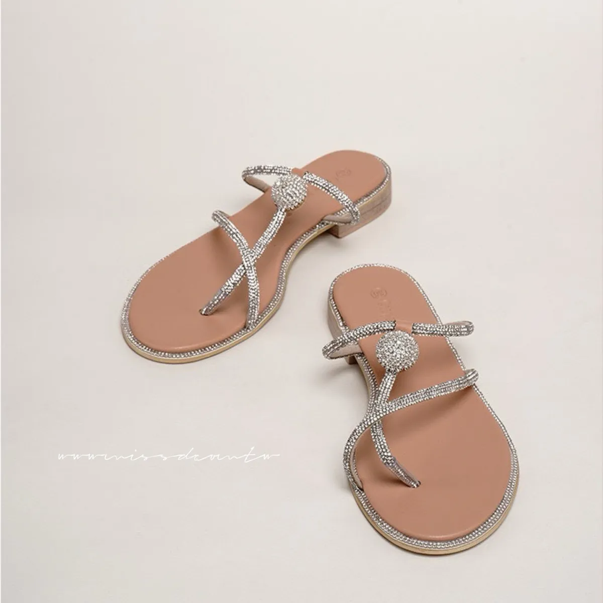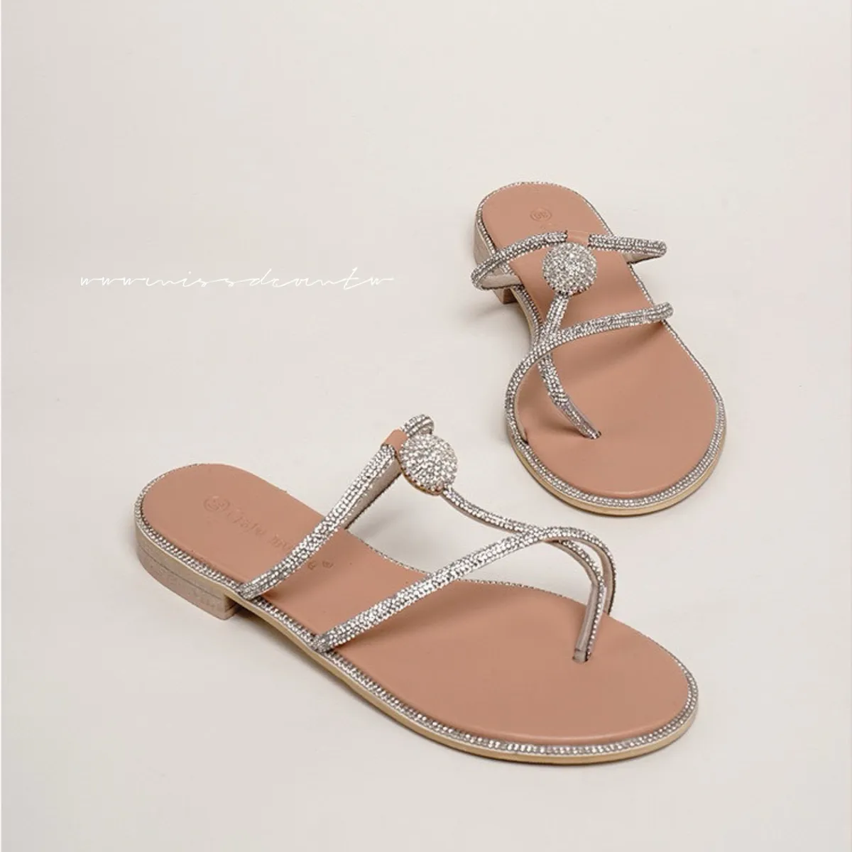 預購-水鑽造型羊皮夾腳拖鞋